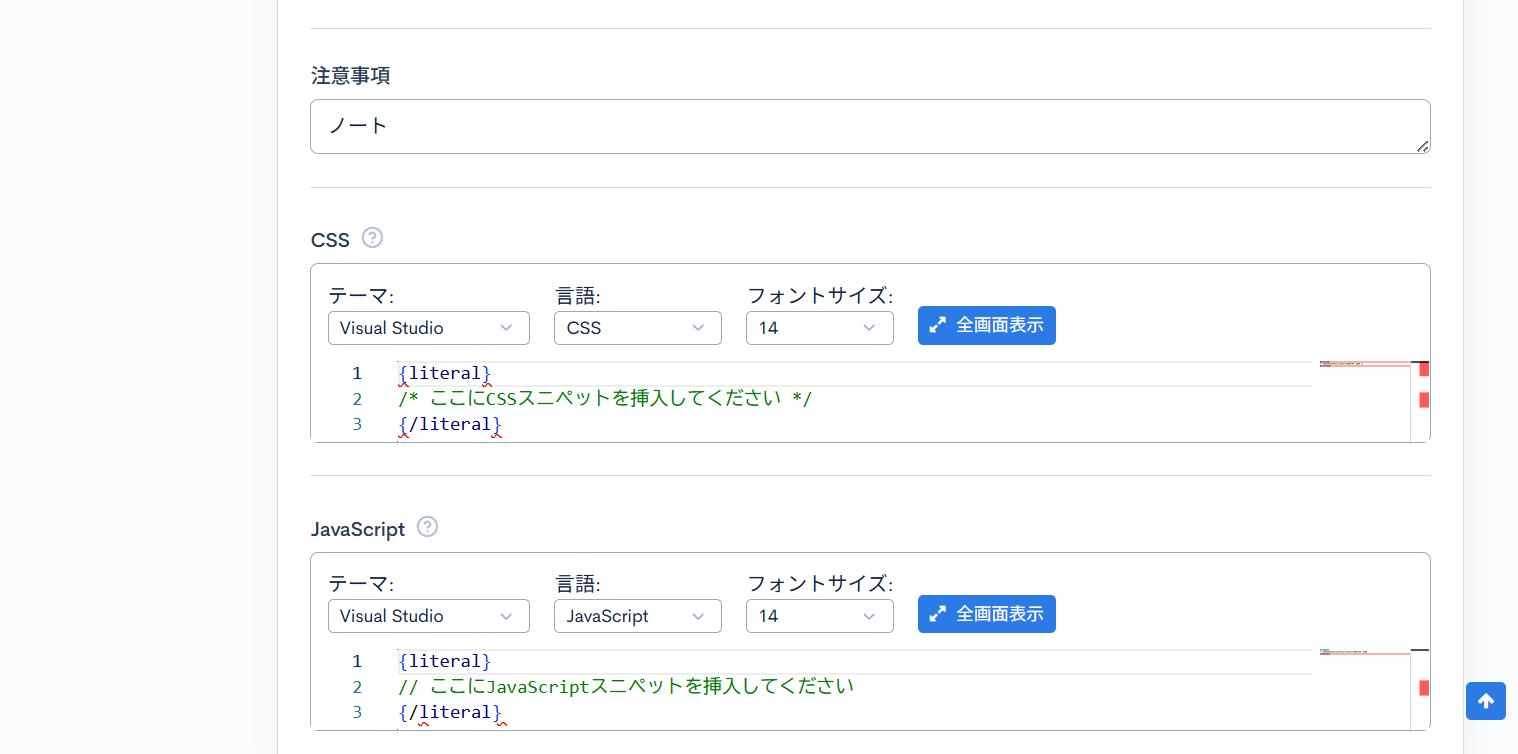 | JavaScript | コンテンツ編集画面のJSを設定することができます。 |