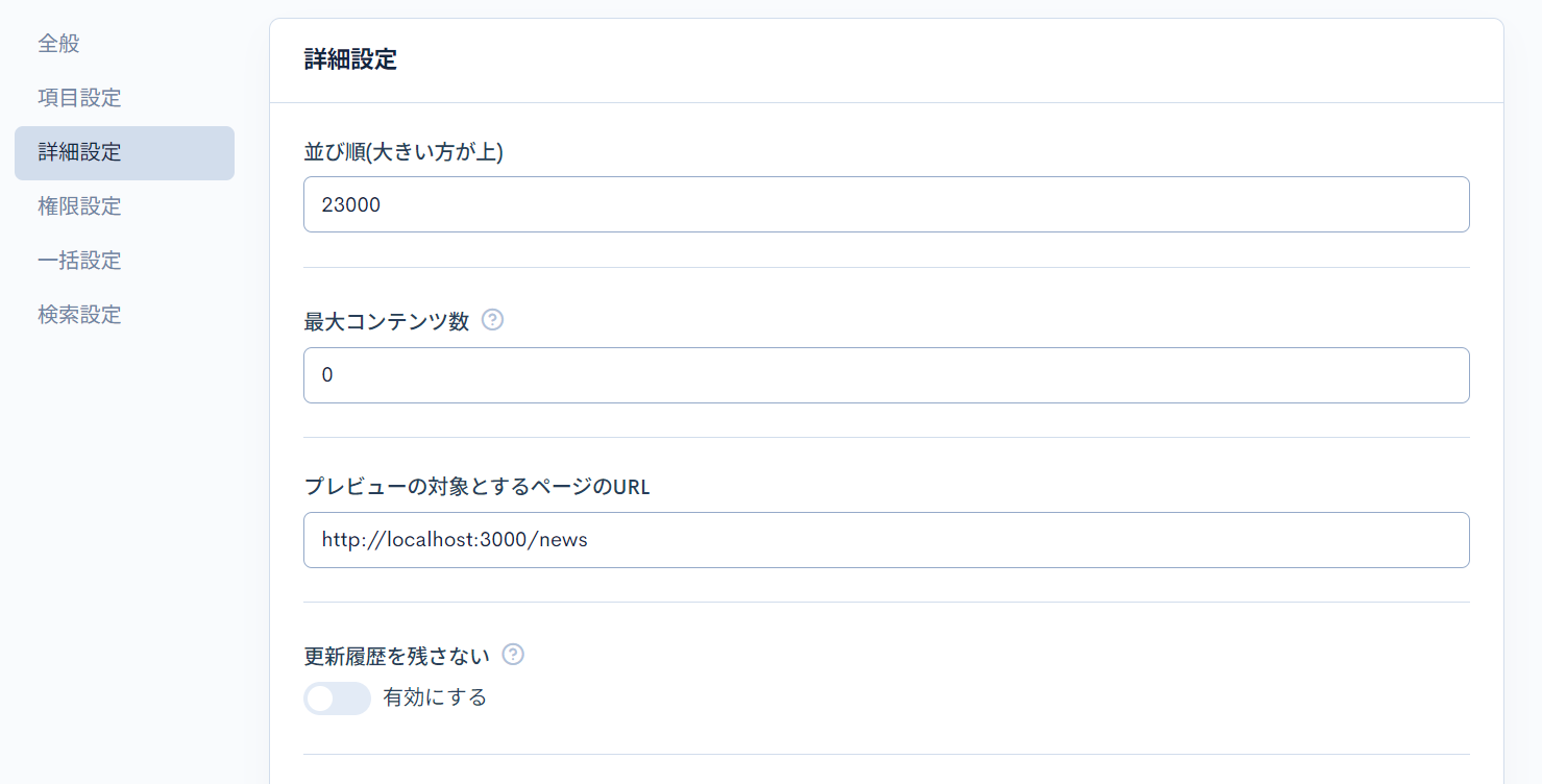 | 最大コンテンツ数 | 最大コンテンツ数を入力します。 ※ 無制限にしたい場合:0 ※ 一覧ページを作成しない場合:1 |