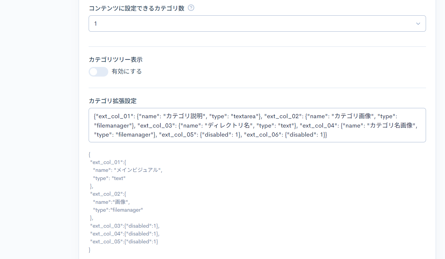 | カテゴリ拡張設定 | サンプルを参考に記述すると、コンテンツカテゴリ編集の入力項目を修正することができます。 |