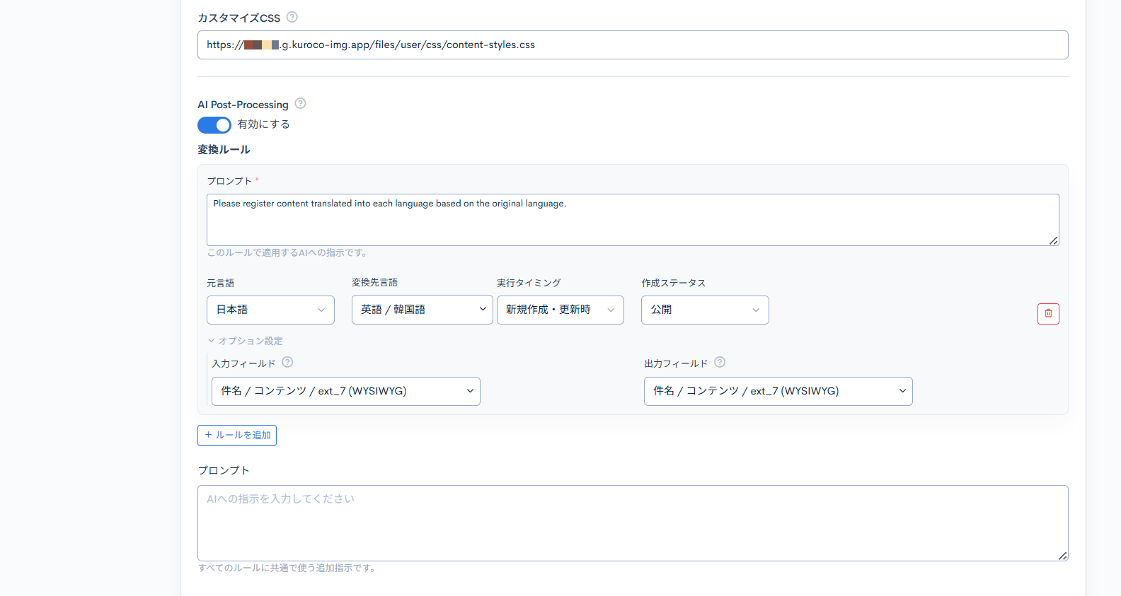 | カスタマイズCSS | CSSのURLをセットすると、指定したCSSをコンテンツ内の全てのエディタで読み込みます。 |