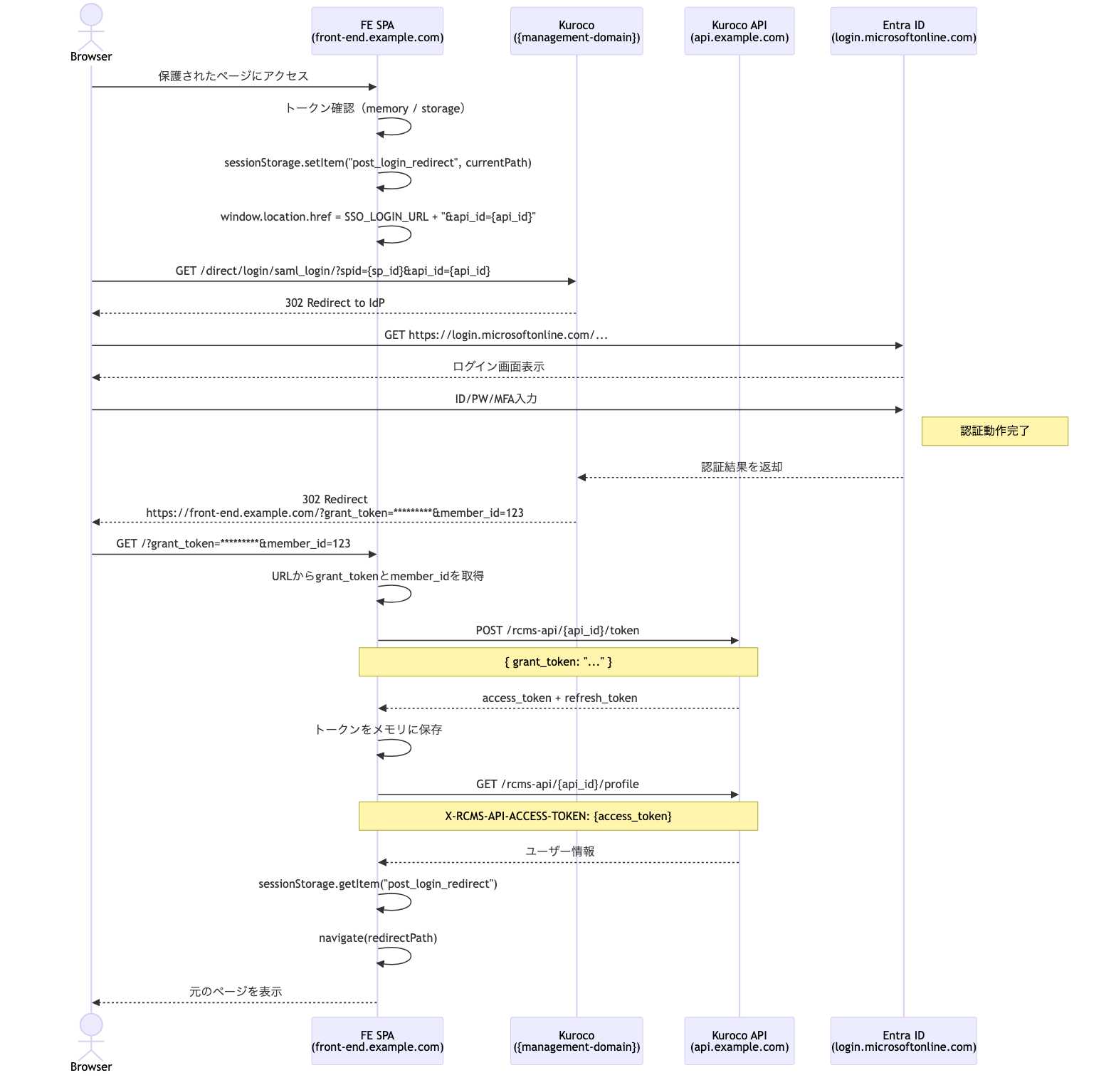 SSOログインURL(例:https://{管理画面ドメイン}/direct/login/saml_login/?spid={sp_id})と、認証後のコールバックURL(リターンURL)は、いずれもKuroco管理画面のSSO設定で管理します。SSO設定画面の 「(API用) Grantトークン生成」 で対象APIにチェックを入れることで、リターンURL遷移時にgrant_tokenパラメータが付与されるようになります。ユーザーの実際の戻り先は、フロントエンド側でsessionStorageを使用して別途管理します。